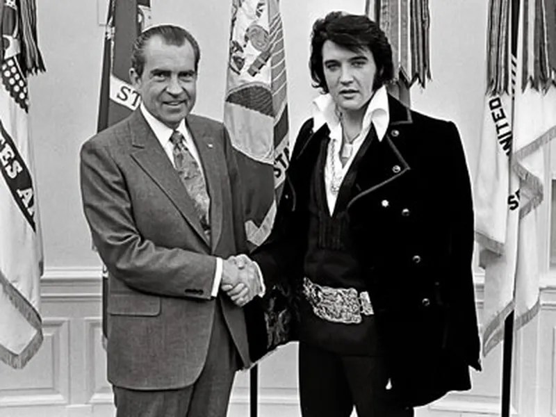 Alors comme ça, on ne peut plus écouter le King pépouze sans se faire emmerder par de la rhétorique de trotskiste de bas étage? Mais si, voyons. Continuez donc à vous déhancher sur Blue Suede Shoes tant que cela vous plaira. Il s’agit juste de garder à l’esprit que même chez ces artistes qui peuvent vous sembler loin de tout positionnement idéologique se cache toujours forcément une dose de politique. Le King lui-même n’a-t-il pas fait le forcing pour rencontrer Nixon ? Une rencontre aussi lunaire que mythique où le roi du rock’n’roll tentât de rentrer dans la Maison Blanche avec ses armes à feu pour taper le bout de gras avec l’homme le plus puissant du monde. Sujet des discussions ? Son souhait de rejoindre le FBI afin d’aider son beau pays à faire la chasse à la racaille communiste et notamment aux Beatles qu’il soupçonne d’œuvrer pour les forces soviétiques.