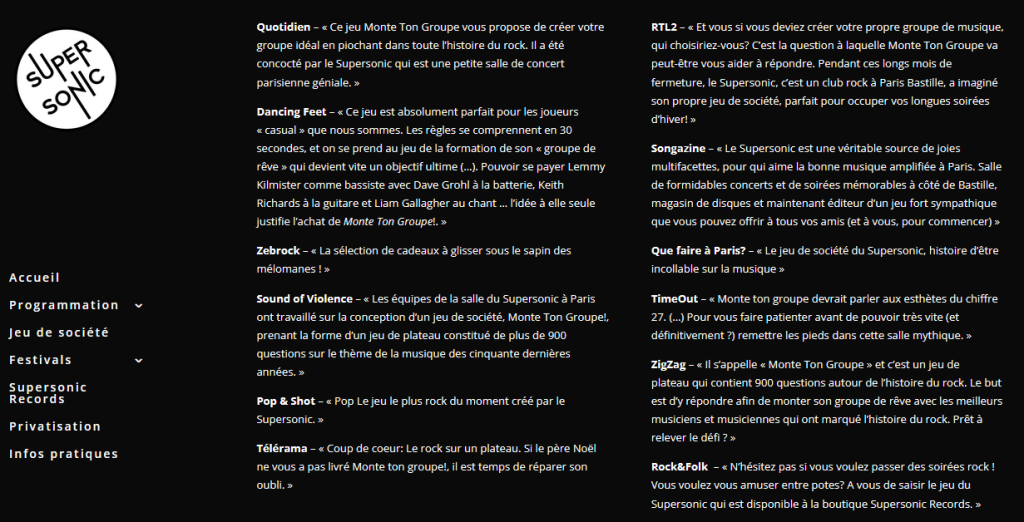 Le Supersonic : nous travaillons au Supersonic depuis 2016 et c’est durant le confinement que l’idée a émergé. La salle a dû fermer pendant 18 mois à cause du COVID. L’été, nous organisions des concerts en extérieur, mais le reste du temps, notre activité était totalement à l’arrêt. Pour nous occuper et nous amuser, nous avons commencé à imaginer notre propre jeu de société Monte ton Groupe. Nous avons rédigé plus de 900 questions/réponses sur la musique rock des années 1960 aux années 2010, et réalisé nous-mêmes tout le graphisme.